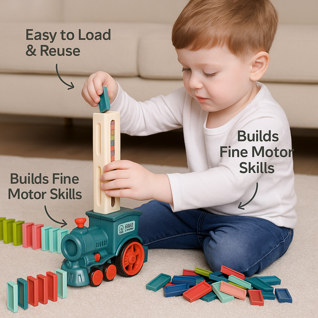 This Montessori Domino Train™ combines the classic fun of dominoes with the excitement of a moving train, dropping colorful dominoes as it moves.
